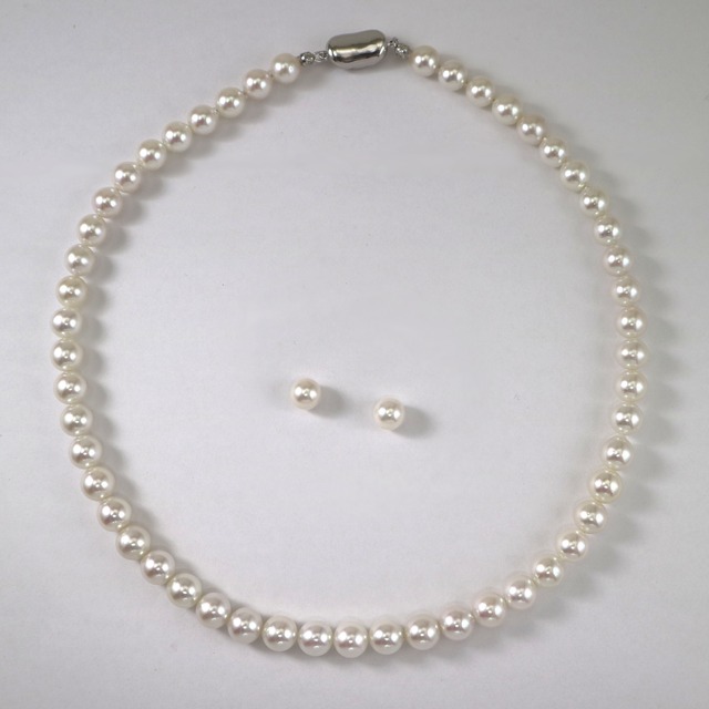 2/14 在庫分終了いたしました。 日本のあこや貝から生まれた真珠はしっとりとしたあこや真珠特有の美しさを持ちます。 こちらはネックレスとお揃いになるように色を合わせてあつらえたイヤリング(ピアス)の2点セットです。 色はほんのりとクリーム色を感じるホワイトにピンクとグリーンが出るテリが良く 表面がきれいな輝きのある真珠です。 形はオフラウンドで目立たず気にならない形です。 しっかりとした巻き質でお勧めです。 大きさは一般的に標準といわれる7.5mm~8mmサイズ 長さはプリンセスサイズと呼ばれる標準サイズの約 42~43cmです。 あこや貝は貝が小さい為、一番大きなものでも10mmくらいまでとされています。 ネックレスサイズ的には小さすぎず、ちょうどよいサイズといえます。 冠婚葬祭やおしゃれに自信をもってお使いいただけます。 ペアは7.5mmでイヤリング/ピアスをご選択いただけるセットになっております。 詳しくは下記をご覧ください。 ネックレスの金具は使いやすいワンプッシュ式の金具を使用。 上下がなくつまんで開閉できるので使いやすいと評判です。 セットケースに入れてお送りいたします。 近年の海の状況や海外事情などもあり、お値段は年々上昇しております。 フカサワ宝石では浜元から直接仕入れ、自社加工することにより良い品をお安くお出しできるよう努力しております。 店頭には他に白系のセットが数点ございます。 ーー重要ーー お耳はイヤリングが初期選択になっております。 シルバー金具ネジバネ式イヤリング、プラチナピアスかどちらかご選択いただけます。 ピアスご希望の方はタブからピアスをご選択ください。 ☆フェア期間中ご購入特典☆ ・真珠専用英国製お手入れクロスプレゼント ・真珠製品お手入れのしおり ・お買い上げネックレスのお仕立て直しサービス券 =お買い上げネックレスのお仕立て直しサービス券= 礼服などに合わせた際に、ネックレスが長く珠を外したい際などにご使用いただけます。 長くする際にはオールパッキン、オールノット、珠足しなどの別途費用が掛かる方法がございます。ご希望の場合は、まずはお電話でご相談ください。 お送りいただく際はお仕立て直しサービス券をご一緒に郵送してください。 素材 あこや真珠7.5㎜-8㎜ ペア7.5mm 金具 SVクラスプ(ワンプッシュ式) [選択式] イヤリング:シルバー / ピアス:Pt900 ※あこや真珠は貝が作り出す天然の宝石です。 一珠ずつそれぞれお色や形が違うので、写真のものと色や形の印象が違う場合がございます。予めご了承下さい。